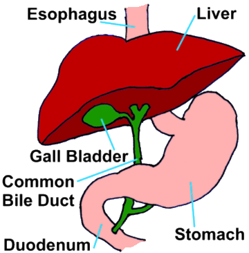 (original graphic by marvistavet.com) You have probably heard of bile ducts but may not really be sure what bile is all about. Bile is a greenish material the liver makes and transports to the gall bladder via small bile ducts. The gall bladder is a small greenish sac about the size of a superball where bile is stored. When the appropriate hormonal signals are present, the gall bladder contracts and squirts bile into the small intestine via one very large duct called the “common bile duct.” Bile has several functions. It emulsifies the fat in our diets so that we can absorb it into our bodies. It also serves as a medium to bind toxins that the liver has processed so they can be expelled into the intestine and defecated away. This is a fine system but problems can occur when the bacteria that live in the small intestine venture up the bile duct and invade the liver, which is normally sterile (free of bacteria). Inflammation results and the liver can fail. This kind of bile duct inflammation is what cholangitis is.