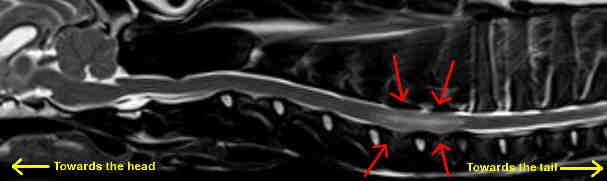 Magnetic Resonance Imaging (MRI) is not yet readily available to most veterinary practices but is likely to become the imaging modality of choice for the diagnosis of FCE. MRI is able to distinguish embolized areas of spinal cord from those with swelling or compression as long as at least 72 hours have elapsed from the initial event. Still, absolute confirmation of the FCE diagnosis requires a piece of spinal cord tissue for analysis and this is not something that would be done in a living patient. For the time being, diagnosis of FCE is made based on the clinical picture of a patient in the appropriate age group with an acute spinal deficit, no other abnormalities on imaging and no painful areas. FCE is unlikely to be a recurrent condition so that if a dog has one episode, they are not likely to experience another.